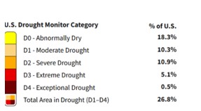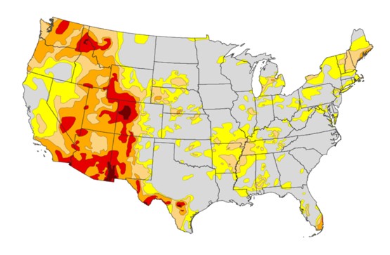 El mapa de abajo (USDA), realizado el 19 de agosto, muestra claros indicios de sequía en estados sureños como Arkansas, Misuri, Misisipi, Tenessee, centrales como Dakota del Sur y Nebraska. Además, en el noreste. Sin tomar en cuenta, el oeste donde la situación es grave.