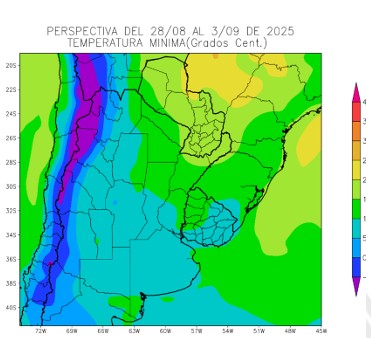 Al inicio de la perspectiva, continuarán soplando los vientos polares, que hicieron su entrada en los días precedentes, la mayor parte del área agrícola observará temperaturas algo bajo la media estacional, a excepción de su extremo norte, que registrará marcas algo sobre lo normal. . El nordeste del NOA, gran parte de la Región del Chaco y la mayor parte de la Mesopotamia observarán temperaturas mínimas superiores a 10°C, con focos con valores inferiores, y registros de mayor entidad hacia su extremo norte.