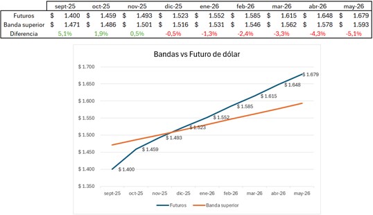 Analizando el mercado de futuros de dólar, podemos deducir que se descuenta un rompimiento del esquema cambiario de bandas de flotación a partir de diciembre/enero. Es decir, se está convalidando un precio para el dólar por encima del techo de la banda para los meses post elecciones.