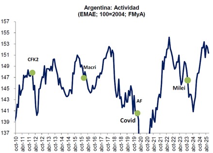 El estimador mensual de actividad económica (EMAE) del mes de junio marcó una caída del 0,7% mensual con respecto a mayo. Si bien el dato marca una suba interanual del 6,4% con respecto a Junio/2024 no hay que dejarse llevar mucho con este indicador ya que se toma una base de comparación muy baja (la economía argentina recuperó gran parte de la caída a partir de Julio /2024 hasta finales de año).