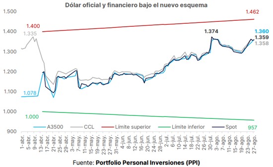 Luego de varias ruedas de volatilidad, el tipo de cambio oficial tocó su máximo en el año en la última rueda de julio, llegando a $1374 (a un 5% del techo de la banda). Parte de este movimiento parece explicarse por la no renovación de los contratos de futuro de dólar por parte del BCRA para los vencimientos de ese día.