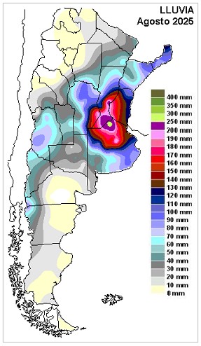 Las precipitaciones fueron sumamente importantes en zonas del centro este de CB, sur de SF y la zona central del norte bonaerense. En muchas localidades (datos no oficiales que no quedan representados en el mapa), los acumulados al cabo de dos días superaron los trescientos milímetros. No fue algo generalizado, pero insistimos, la media normal de agosto es a lo sumo de cuarenta milímetros en el centro de la zona núcleo. El área donde las lluvias dejaron al menos ciento cincuenta milímetros cubre casi toda la zona agrícola principal.