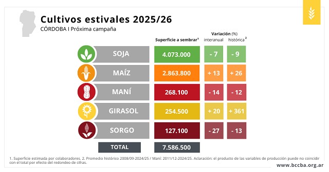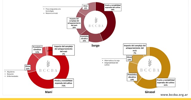 En el caso de maní y sorgo, se espera una disminución de superficie en comparación tanto con la campaña pasada como con el promedio histórico.