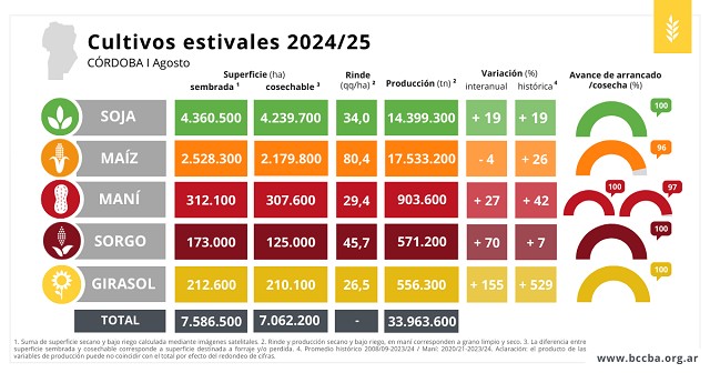 La campaña 2024/25 finaliza con rindes superiores a los registrados en el ciclo anterior, con la cosecha de maíz y maní prácticamente concluida, pese a los atrasos que presentaba. En el caso del maní, las lluvias fuera de época complicaron la etapa de arrancado y demoraron la recolección, lo que derivó en un mayor porcentaje de tierra en la caja en la zona sur de la provincia, además de posibles impactos sobre la calidad del grano.