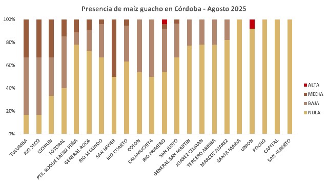 También se relevó la presencia de maíz guacho. En la mayoría de los lotes del centro y sur la incidencia fue nula o baja, principalmente a causa de las bajas temperaturas registradas en julio. Sin embargo, en los departamentos del norte se reportaron casos de presencia media, asociados a nuevas emergencias ocurridas tras el aumento de las temperaturas en los últimos días.