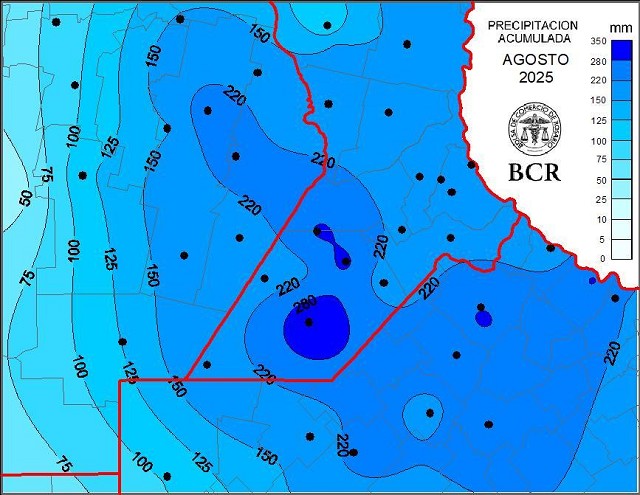 En Monte Maíz los técnicos las calificaron así, con registros de lluvias en agosto que no se daban en 90 años en la localidad. Al principio, ese término parecía algo excesivo, ya que expresa un evento inesperado, muy raro y de altísimo impacto. Pero realmente lo fue: la región recibió como promedio mensual de las 36 estaciones de la red GEA/BCR 193 mm cuando la media histórica es de 30 mm. Este agosto fue el más lluvioso de los últimos 30 años, superando con margen al mismo mes del 2015. Lo superó por montos y cobertura. El valor más destacado de agosto supera largamente los 300 mm: María Teresa con un acumulado de 344 mm, Chovet le sigue con 290 mm, Godeken con 288 mm y Pergamino con 286 mm.
