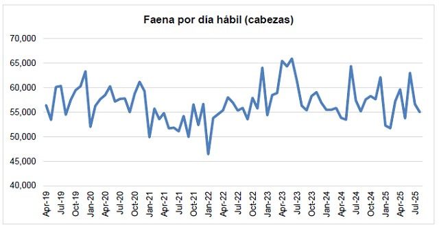 La faena diaria del mes de agosto del corriente año, se ubicó en 55,0 mil cabezas, un (-2,9%) por debajo de las 56,7 mil diarias procesadas en julio, y un (-0,2%) inferior a las 55,2 mil correspondientes a agosto de 2024.