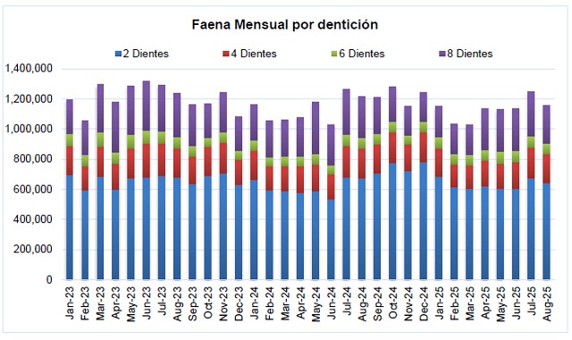 En los primeros ocho meses del año 2025, se faenaron 9,01 millones de bovinos; un (-0,3%) menos que los 9,04 millones que se habían faenado entre enero y agosto de 2024. Las mayores diferencias interanuales en la faena provienen de las hembras de ocho y más dientes, que recortaron en 84,5 mil cabezas la faena acumulada en los primeros ocho meses del año pasado, las hembras de seis dientes, que mostraron una caída interanual de la faena cercana a las 106,0 mil cabezas, y, por los machos de cuatro dientes, cuya faena disminuyó en cerca de 19,1 mil cabezas a la registrada entre enero y agosto del año 2024; en sentido contrario, se incrementó la faena de hembras de dos dientes en aproximadamente 127,6 mil cabezas, la de machos de seis dientes en 58,3 mil cabezas, y la de machos de dos dientes en 17,5 mil cabezas.