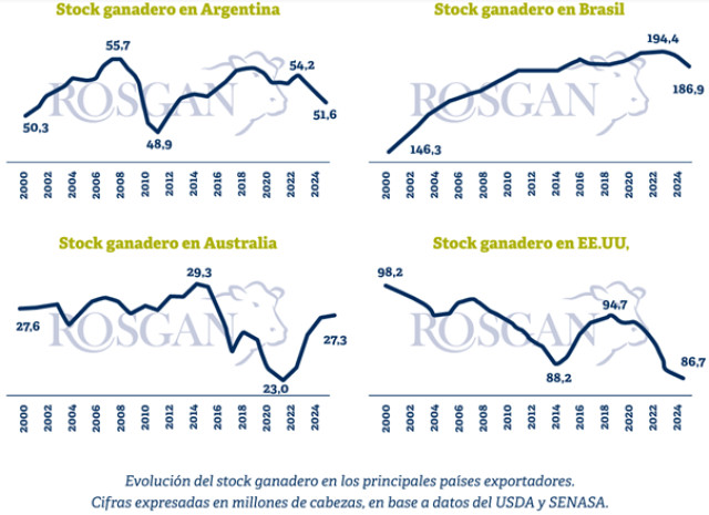 Aunque los cuatro registran caídas significativas en sus stocks, los factores desencadenantes difieren tanto en su naturaleza como en su temporalidad. En el caso de Australia, si bien —al igual que EE. UU.— ha sido afectada por una sucesión de sequías muy severas y prolongadas, lo cierto es que no solo ya ha iniciado su proceso de reconstrucción del stock, sino que, además, a lo largo del mismo ha logrado mejoras sustanciales en términos de eficiencia productiva. Esto le permite ser el país mejor posicionado para capturar mayores oportunidades comerciales dentro de este escenario, sin comprometer la evolución de su stock.