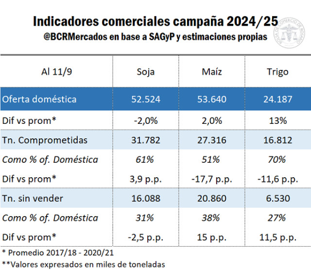 Mientras tanto, la comercialización de maíz corre con mayor rezago aún. Quedan casi 21 Mt sin comprometer, máximos para esta altura de la campaña y, en términos relativos a la oferta disponible, es la proporción más alta en por lo menos catorce años.