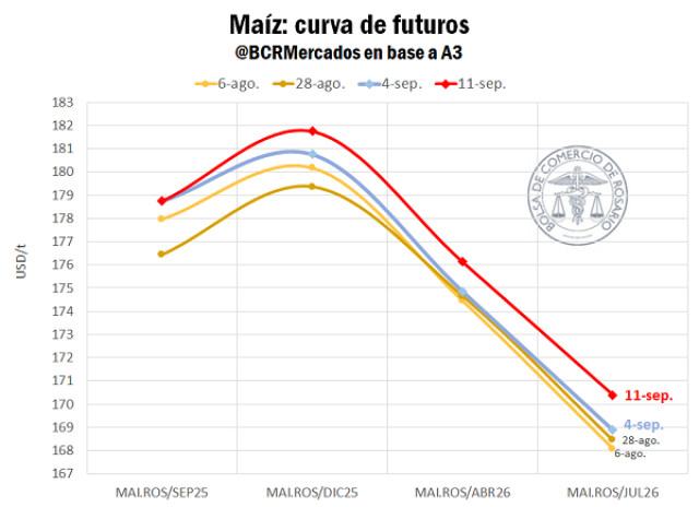 El FOB se mantiene en torno a los UDS 200/t y a estos niveles de precios en el mercado local, el margen teórico de la exportación de maíz viene siendo negativo en USD 4/t. Mirando hacia delante, la curva de futuros se ha estado desplazando hacia arriba y la posición diciembre llega a los USD 182/t, mejorando en USD 6/t lo que se paga hoy por maíz en el disponible, más alto que el año pasado a esta altura y un 10% arriba de Chicago.