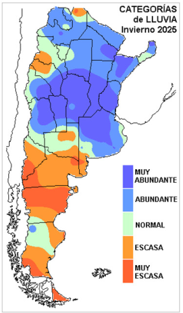 La comparación de las lluvias registradas en el trimestre junio-agosto con los valores estadísticos, define la anomalía estacional, la cual queda claramente dominada por los desvíos positivos en toda la zona agropecuaria principal del país, con una gran influencia negativa sobre la pampa deprimida bonaerense. En esta vasta región, prevalecen entre dos y tres millones de hectáreas con distinto grado de complejidad vinculada a los excesos hídricos, desde saturaciones temporarias hasta inundaciones que demandarán varios meses para ser resueltas. Debemos recordar que gran parte de la provincia de BA ya venía del trimestre anterior con una anomalía positiva muy similar, la cual se vio moderada hacia LP y el sudoeste de BA, hasta ingresar en la zona más seca el norte de la Patagonia. Si bien la anomalía positiva del NOA no es representativa en el invierno, igualmente se han dado algunas lluvias que no suelen aparecer en aquella región.