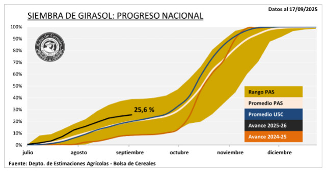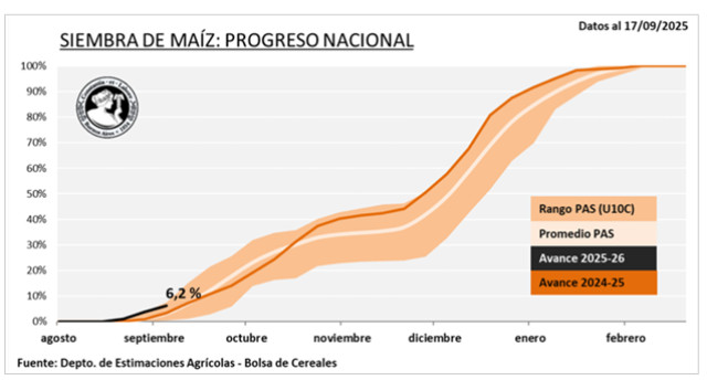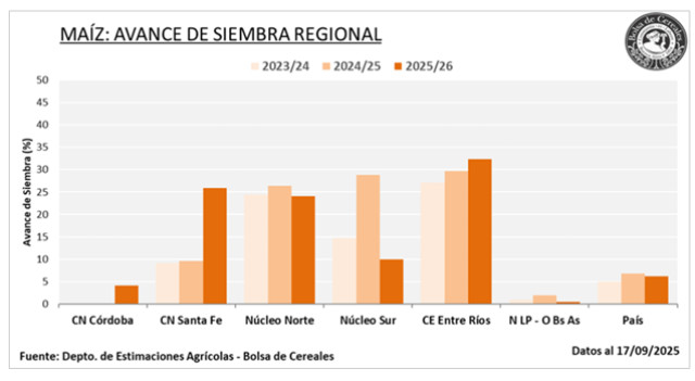 Esta situación ha generado una dinámica acelerada en las labores, buscando aprovechar las condiciones actuales de piso antes del ingreso de precipitaciones que podrían interrumpir el avance. A la fecha, se estima que el avance de siembra alcanza el 6,2 % de las 7,8 MHa proyectadas para la campaña 2025/26. En Córdoba, la buena disponibilidad hídrica impulsa la siembra temprana de manera anticipada, donde podría representar el 25 % de los planteos, en contraste con la campaña anterior donde representó el 15 %. Asimismo, en la zona núcleo la buena humedad está siendo aprovechada y los productores coinciden en que la siembra temprana superaría el 80 % del total zonal.