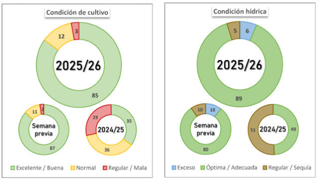 A nivel nacional, el 91 % del área implantada presenta una condición hídrica entre Adecuada/Óptima, mientras que el 88 % presenta una condición de cultivo Normal/Buena.