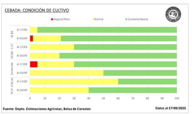 En lo que respecta a la cebada, a nivel nacional, el 91 % del área implantada presenta una condición hídrica entre Adecuada/Óptima, en consecuencia, el 88 % de los cultivos se encuentra en estado Normal/Bueno. Bajo este contexto el 66 % transita el pleno macollaje, mientras que el 32 % ya ha iniciado la etapa de encañazon, principalmente sobre la región central. Sobre los núcleos cebaderos del sur, el 82,5 % presenta una condición Normal/Buena. Tras las últimas lluvias se han iniciado las aplicaciones de fungicidas.