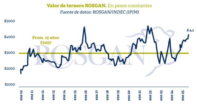 Este comportamiento se confirma con los valores registrados por el ternero en el último remate de ROSGAN, donde el índice de referencia correspondiente a septiembre mostró una suba mensual del 10,5%, situándose en niveles de $4.186 el kilo vivo.