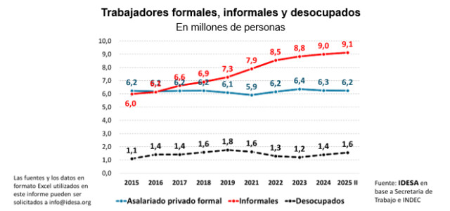 Los datos del INDEC sobre el mercado laboral correspondientes al 2º trimestre del 2025 señalan que la ocupación total se mantuvo estable en 13,3 millones de personas en los grandes aglomerados urbanos con respecto al mismo período del año anterior. La tasa de desempleo también se mantuvo en 7,6% de la población activa lo que equivale a 1 millón de personas sin trabajo que buscan activamente un empleo. Si bien no se modificó la cantidad de ocupados, aumentaron la informalidad y la gente que estando ocupada busca trabajar más.