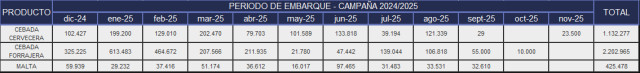 Para Malta de Cebada, las Declaraciones Juradas de Exportación para la campaña 2024/25 suman 425.478 tn (anterior 388.851 tn).