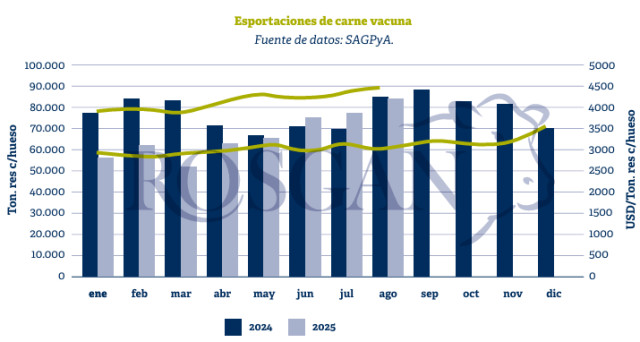 En este contexto, la semana pasada se dieron a conocer los datos de exportación de carne vacuna correspondientes al mes de agosto, que reflejan una importante recuperación del sector exportador. La reciente reducción parcial de las retenciones, junto con la mejora del tipo de cambio, ha permitido que las exportaciones comiencen a consolidarse en un mercado internacional con alta demanda.