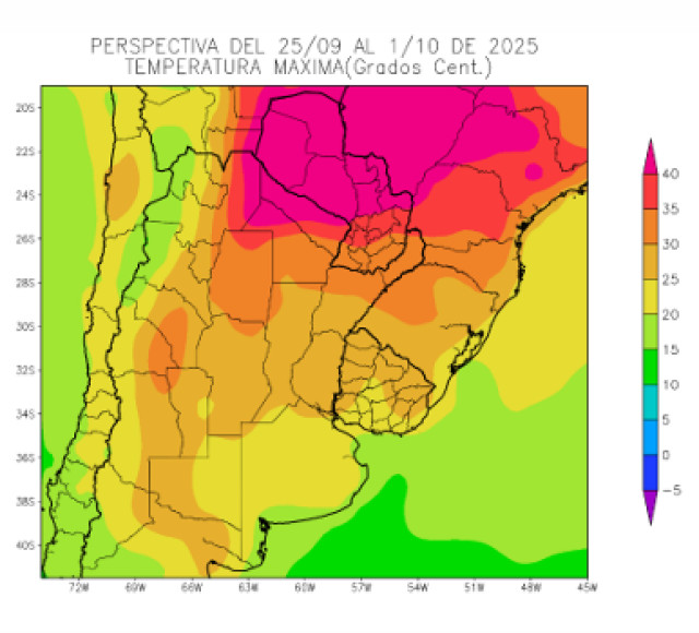 La perspectiva comenzará con temperaturas algo bajo lo normal, pero el pronto y vigoroso retorno de los vientos del Trópico producirátemperaturas sobre lo normal en la mayor parte del área agrícola, con focos de calor intenso sobre todo el norte y el centro norte, y registros elevados, peromenos extremos sobre el centro-sur y el sur y las zonas cercanas al Litoral Atlántico.