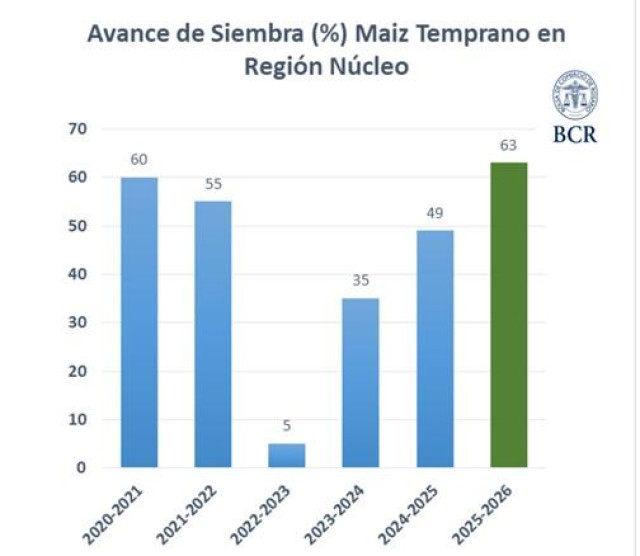 En la región núcleo, el maíz temprano pisa el acelerador: se sumaron 400.000 hectáreas en los útlimos 7 días y el avance ya alcanza el 63%. Restan para terminar 750.000 hectáreas. “Se está trabajando a todo ritmo para ganarle a las lluvias pronosticadas para el fin de semana”, dicen los técnicos de Corral de Bustos, donde esperan terminar en estos días. El ritmo supera al de las últimas 5 campañas, que promedian un 45% para esta fecha.