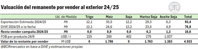 En primer lugar, partiendo de la estimación de exportaciones para la campaña 2024/25 de los principales productos de los tres complejos (trigo, maíz, soja y sus derivados), se tiene que el volumen total proyectado a despachar al exterior suma 93,4 Mt. De éstos, 76,8 Mt ya se han vendido, y registrada su respectiva Declaración Jurada de Venta al Exterior (DJVE) al 25 de septiembre. Si se valúa la mercadería que resta vender al exterior de la campaña 2024/25 al precio FOB de exportación vigente el miércoles 24/9, se estima que el valor total del trigo, el maíz, y el poroto, la harina y el aceite de soja que resta vender al exterior para cumplir con la proyección exportadora estimada para la campaña alcanza a US$ 4.933 millones.