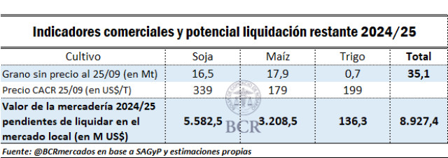 Valuando este tonelaje al precio de la Cámara Arbitral de Cereales de Rosario del jueves 25/09 el monto pendiente de pagarle al vendedor doméstico del grano asciende –teóricamente- a US$ 8.927 millones de dólares.
