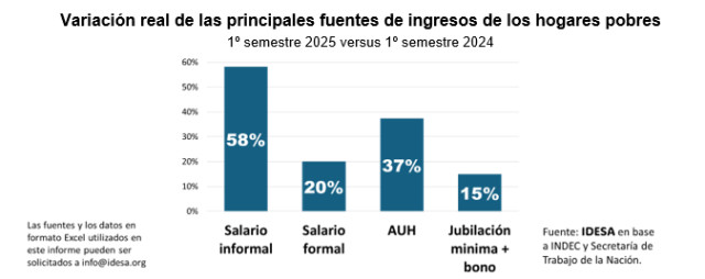En el contexto de acelerada baja de la inflación, según el INDEC, estas fuentes de ingresos entre el primer semestre del 2024 e igual periodo del 2025 tuvieron las siguientes variaciones reales ajustadas por lo que subió la Canasta Básica Total (línea de pobreza):