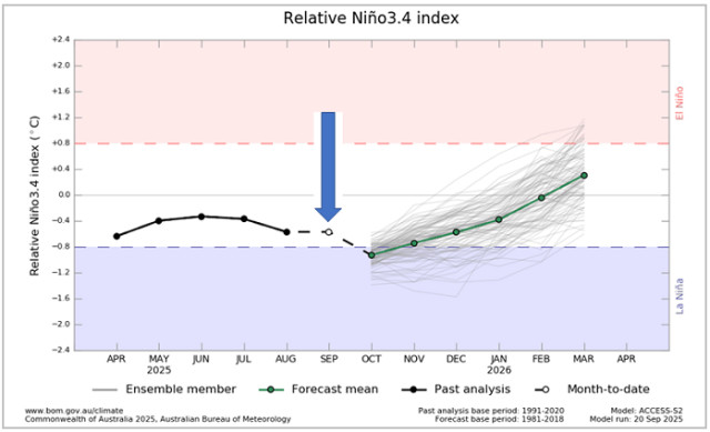 El grafico generado por el Servicio Meteorológico de Australia, un instituto de alta relevancia junto con la NOA en el monitoreo y la estandarización de los pronósticos del ENSO, presenta una posición de neutralidad por estas fechas (flecha azul). Se está previendo sin embargo, que el enfriamiento oceánico converja sobre un débil escenario La Niña entre octubre y noviembre, ya saliendo de esta posición durante diciembre. En una interpretación pesimista de este gráfico podríamos decir que la última parte del año será bajo señal La Niña. Partiendo de la foto actual que muestra el Pacifico Ecuatorial central, es indudable que el enfriamiento ha resurgido, su injerencia sobre la atmosfera entendemos que tiene pocas chances de ser relevante.