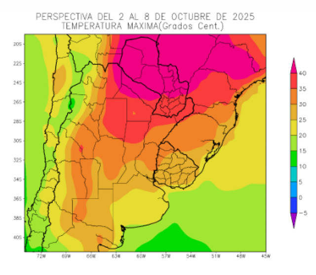Pese al retorno de los vientos del Trópico durante los días precedentes, la perspectiva comenzará con temperaturas algo bajo lo normal, pero muy pronto se alcanzarán marcas elevadas en la mayor parte del área agrícola, con focos de calor intenso sobre el norte, y registros elevados, pero no extremos sobre el centro y el sur, mientras el Litoral Atlántico observará valores algo inferiores a la media.
