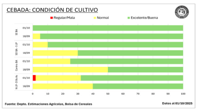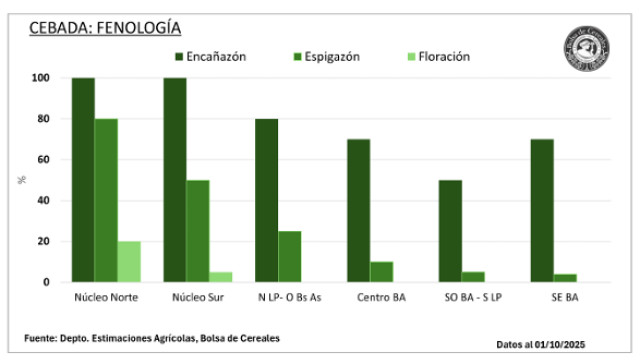 A nivel nacional, tras las últimas precipitaciones, el 88 % de la superficie implantada con cebada presenta una condición hídrica Adecuada/Óptima y casi 9 de cada 10 hectáreas mantienen un estado de cultivo Excelente/Bueno, en línea con el informe previo. En este contexto, el 13 % de los lotes ha iniciado la etapa de espigazón y un 1 % la floración, principalmente en los núcleos norte y sur. En el sur bonaerense, la elevada humedad ha favorecido la aparición de enfermedades tales como “mancha en red”, lo que impulsó la continuidad de las aplicaciones fúngicas.
