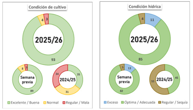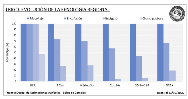 Con un 70 % habiendo iniciado el periodo de encañazón, el 87 % sostiene una condición de cultivo Excelente/Buena, tras las óptimas condiciones hídricas.