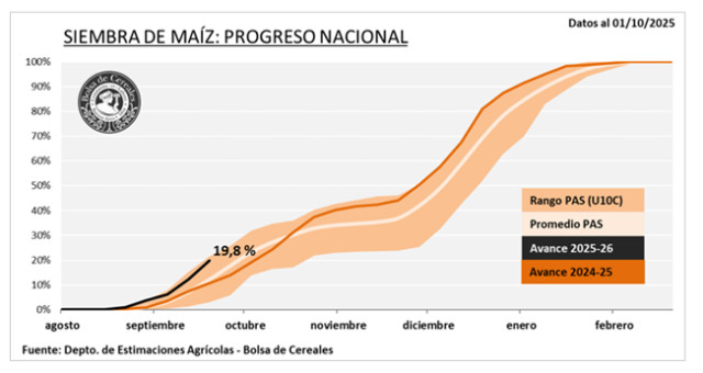 La siembra avanza sobre el 19,8 % logrando un progreso intersemanal de 7,4 p.p. y un adelanto interanual de 7 p.p. La provincia de Buenos Aires continúa reportando atrasos en las labores debido a excesos hídricos.