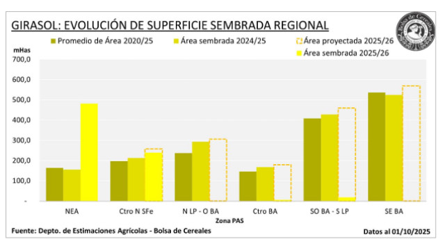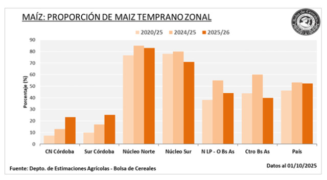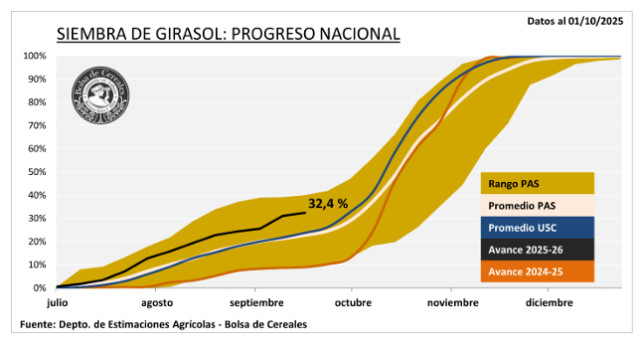 El área proyectada se ajusta a 2,7 MHa, de la cual ya se sembró el 32,4 %, manteniendo adelantos de 12,3 y 22,1 p.p. en comparación al promedio U5C y 2024/25, respectivamente. Luego de las lluvias, se anuncian demoras en el inicio de las labores sobre el sudoeste agrícola.