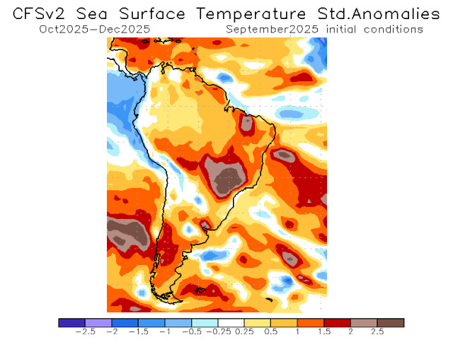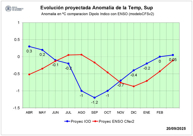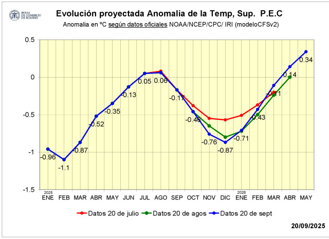 Con la siembra maicera en Argentina en marcha, peleando contra los excesos y buscando llegar a los lotes entre las tormentas que han ganado frecuencia semanal, la NOAA muestra una anomalía de la SST (temperatura superficial del mar) con un actual valor (setiembre) de -0,4, o sea casi saliendo de Neutralidad. La diferencia respecto a un mes atrás, es que la evolución proyectada de la anomalía en el mes de setiembre versus lo proyectado en agosto muestra valores de enfriamiento levemente mayores por debajo del umbral de -0,5. En agosto el valor más bajo se preveía en -0,8 para diciembre. Ahora, en setiembre, se observa un valor de -0,87. Este mayor enfriamiento también se nota en noviembre: -0,76 (vs -0.65). Pero no para enero: -0,71 ahora contra -0,72 hace un mes. ¿Qué significan estos números? Primero, que se ratifican valores de una probable Niña de intensidad leve y corta duración. Lo segundo es que “el rebote”, la vuelta a Neutralidad, se estaría acelerando y dando antes de que termine enero 2026. De hecho, para febrero 2026 se proyecta un valor de -0,43 (vs -0,5 proyectado en agosto). Entre los meses de enero y mayo del 2026 se hace evidente un calentamiento muy sostenido que invita a preguntarse si no es un “Niño” lo próximo que puede estar caracterizando a la fase del Pacífico.
