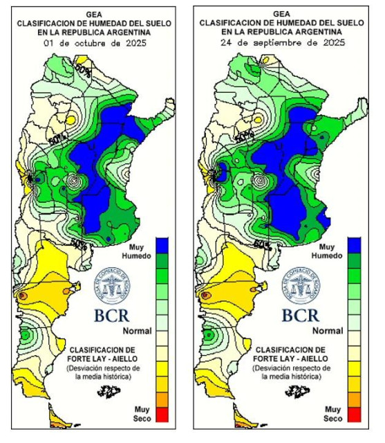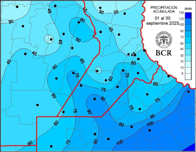 Con un cuarto fin de semana de lluvias recurrentes, un gran sector, el 60% del área, recibió 10 a 30 mm y el resto 40 a 50 mm. Así se va setiembre dejando cierto alivio. La media histórica del mes está en torno a los 50 mm (con 30 a 70 mm de oeste a este). Septiembre 2025 termina por encima de esos valores, con 45 a 100 mm, como se observan en la imagen, y con una media de 61 mm como promedio de las 36 estaciones de la red GEA/BCR.