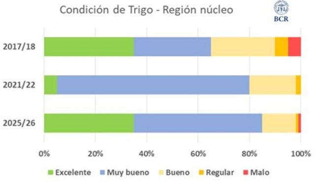 Actualmente, el 85% del trigo de la región núcleo se encuentra entre excelentes y muy buenas condiciones. Hay un 12% bueno y un 3% entre regular y malo. Al comparar con las campañas 2017/18 y la 2021/22 —las mejores de los últimos 16 años, con rindes de 44,6 y 47,3 qq/ha respectivamente— se observa que este año el cultivo llega en una situación más favorable. En el 2017, apenas el 65% del área estaba en condición excelente a muy buena y el 10% se veía comprometido por excesos de agua. En 2021, el 80% del cultivo estaba excelente a muy bueno, pero la falta de lluvias reducía el potencial de rinde en un 2% del área.