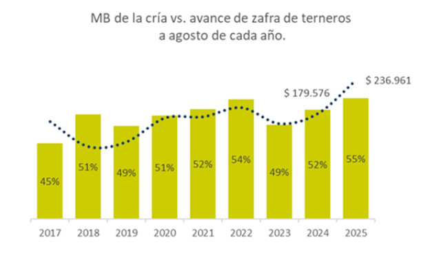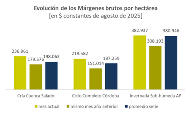 De igual modo, el modelo productivo que contempla un sistema de ciclo completo en el centro-sur de Córdoba ofrece actualmente un margen bruto de $219.582 por hectárea, lo que representa un 17% superior al promedio de la serie y un 45% más alto que en agosto de 2024.
