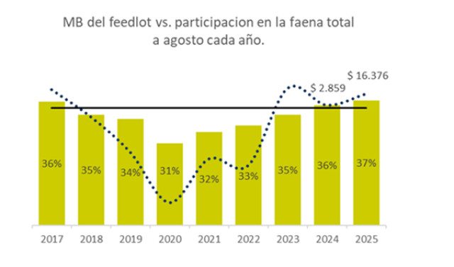 Este año, aunque el margen es ajustado —volviéndose negativo tras considerar el costo financiero de la actividad—, hasta agosto fue uno de los períodos más saludables para el feedlot, lo cual también se refleja en la participación de sus animales en la faena total.