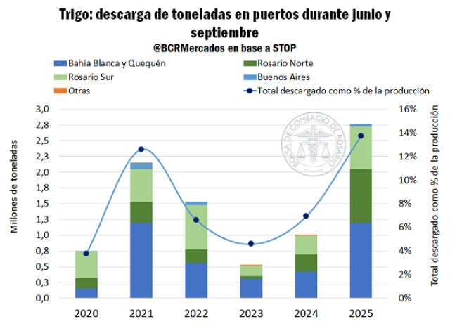 En términos comerciales del mercado doméstico, esto implica dos cosas. En primera instancia, la demanda externa se canaliza a través de las compras del sector exportador en el mercado de granos, por lo que sostiene el ritmo comercial y las entregas de mercadería. Esto puede graficarse fácilmente con las descargas totales de trigo entre junio y septiembre a los Puertos, siendo que durante este año se despacharon 2,8 Mt del cereal en todos los puertos del país, casi tres veces más que el año pasado y más del doble que el promedio durante el último tiempo.