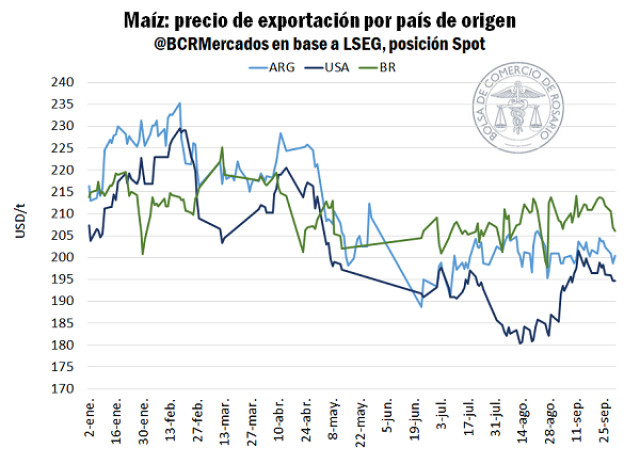 Mientras tanto, el FOB argentino sigue siendo competitivo en Sudamérica, pero aun así el volumen embarcado no termina de arrancar. Durante septiembre se habrían embarcado solo 1,6 Mt de maíz, mínimos en diez años.
