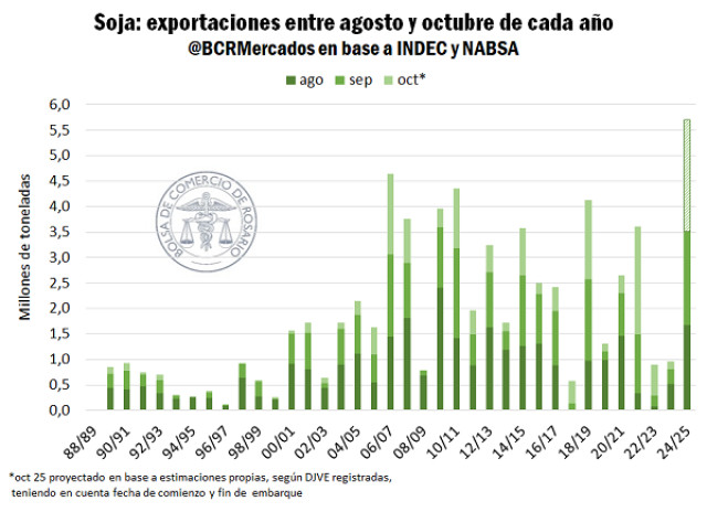 A esta presión de demanda, hay que sumarle el abultado volumen de ventas externas que se disparó la semana pasada y que se suma en el line-up hacia delante. Hay más de 900.000 toneladas de soja programadas para embarcar durante la primera mitad de octubre, algo atípico para esta altura del año y que habíamos visto durante el 2022, en el marco de la primera edición del “dólar soja” (ver). Bajo este escenario, teniendo en cuenta las toneladas registradas en ventas al exterior y las fechas de embarque declaradas en las mismas, estimamos que en octubre se podrían embarcar hasta 2 Mt de soja (en base a estimaciones del Departamento de Estudios Económicos BCR). De cumplirse estas proyecciones, o simplemente de sobrepasar las 1,1 Mt exportadas durante este mes, el trimestre agosto – octubre del 2025 sería récord para las exportaciones de poroto. La relevancia de este trimestre no es menor, ya que es estacionalmente el período de mayor competitividad de la soja norteamericana, graficando el efecto que está teniendo el conflicto comercial entre Estados Unidos y China y sus implicancias en la comercialización local de soja.