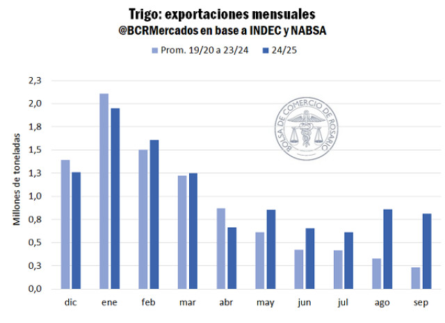 El mercado exportador de trigo está teniendo una excelente segunda mitad de campaña, habiendo embarcado 2,9 Mt desde junio hasta septiembre y marcando un récord de exportaciones para el último bimestre, con más de 800.000 toneladas embarcadas para cada mes.