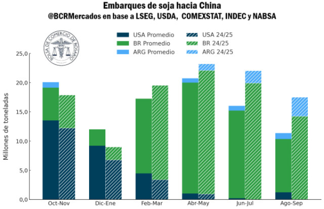 En el mientras tanto, la soja norteamericana está perdiendo participación en su mercado comprador predilecto durante el “prime time” del poroto. Entre octubre y enero Estados Unidos embarca en promedio el 77% de las toneladas con destino a China. Hasta ahora el tonelaje comprometido sigue siendo nulo, cuando a esta altura el año pasado ya había 8 Mt acordadas. Esta tendencia es la que ha prevalecido durante más de la segunda mitad de la campaña 2024/25 que acaba de finalizar.