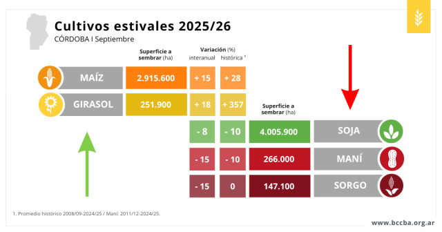 Se realizó una segunda estimación de superficies de cultivos estivales 2025/26, donde se mantuvo la tendencia del mes pasado: se esperan aumentos de maíz, recuperándose del recorte del ciclo pasado, y de girasol, confirmando la importancia alcanzada el año pasado por el incremento de superficie y producción. En contraposición, disminuiría la superficie de soja, maní y sorgo. La siembra de girasol se inició a principios de septiembre, sin datos aún de avances de esta, y la de maíz habría iniciado también, en la zona sur y sureste, a mediados de septiembre.