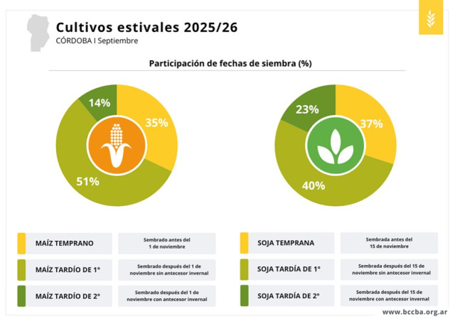 La soja, sin embargo, tuvo una disminución en la superficie que se planifica sembrar temprano y un aumento en la proporción de tardía de segunda ya que en esta campaña hubo mayor superficie sembrada con trigo, por lo que los lotes se liberarán más tarde.