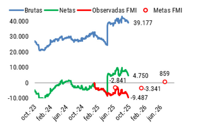 Como consecuencia a estos problemas, aumentaron las expectativas de devaluación y la búsqueda de cobertura preelectoral, que presionó la demanda de dólares (oficiales, financieros y futuros) y agregó stress al mercado financiero. En este marco, el anuncio de un acuerdo con el Tesoro de Estados Unidos logro estabilizar transitoriamente la situación, pero no disipó la incertidumbre ni la presión cambiaria que reaparecieron rápidamente esta semana. En principio, dado los últimos datos oficiales, se podría hacer frente a la demanda de divisas con las reservas del Tesoro (USD 3 millones) y del Banco Central (USD 13 mil millones), pero los dólares que se destinen a ello dejarían de estar disponibles para efectuar pagos de deuda en el futuro (USD 4.300 millones en ene-26), incrementando las dudas respecto a la capacidad de honrar los compromisos en moneda dura del país.