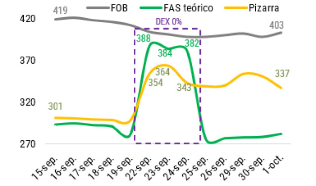 La segunda medida adoptada fue la suspensión temporal de los DD.EE. para soja, maíz, trigo, sorgo, cebada, girasol y sus respectivos subproductos hasta el 31/10/2025 o hasta que se alcancen el equivalente a USD 7.000 millones en declaraciones juradas de venta al exterior (DJVE). También se incluyó a las carnes avícolas y bovinas, aunque con su reglamentación particular. Si bien las DD.EE. son un tributo distorsivo que perjudica fuertemente a la producción agropecuaria y deben ser eliminadas, el carácter temporal de la medida sumado al tope establecido en USD 7.000 millones generó que buena parte de los beneficios no sean apropiados por los productores. De hecho, el cupo se alcanzó rápidamente a los 3 días de anunciada la suspensión, con solo cerca de la mitad del volumen efectivamente comprado . En consecuencia, si se analizan los precios teóricos de los granos que deberían haberse reflejado en el mercado, se observa que no fue trasladado el 100% de la reducción temporal de los DD.EE. a los productores (pese a que cuando está vigente recae sobre ellos). En la soja, principal cultivo comercializado y sobre el que regían las mayores alícuotas de DD.EE., el precio promedio de venta se encontró en promedio un 10% por debajo de su valor teórico. El precio disponible en la pizarra de Rosario debería haber aumentado un 26% del viernes 19 al lunes 22 (de ARS 440 mil a ARS 552 mil), pero solo lo hizo en un 15% (de ARS 440 mil a ARS 505 mil). De este modo, el costo fiscal de esta exención terminó siendo de ARS 2,1 billones, equivalente a USD 1.535 millones y a 0,2% del PBI. Vale mencionar que, una vez reinstaurados los derechos de exportación, los precios pizarras se mantuvieron 15% por encima del valor esperable dado que queda un saldo de compras pendiente, situación que todavía brinda oportunidades para capturar precio.
