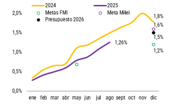 En primera instancia, el resultado adverso en las elecciones provinciales (PBA) hizo eco en las jornadas posteriores, con una caída acumulada del Merval del 12% en la semana posterior. En paralelo, el Gobierno buscó retomar la agenda política con la apertura de una mesa de diálogo con los gobernadores que permita tener mejores resultados legislativos de cara a la nueva composición del Congreso en 2026, estabilidad reclamada por el Tesoro de Estados Unidos y por el FMI. Además, ratificó el rumbo económico, poniendo principal énfasis en el compromiso inquebrantable con el superávit fiscal. El resultado acumulado del 1,3% del PBI hasta agosto augura el cumplimiento de la exigencia del FMI (1,2% del PBI a diciembre) y queda cerca de cumplir el objetivo que se autoimpuso el Gobierno (1,6% del PBI a diciembre).