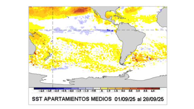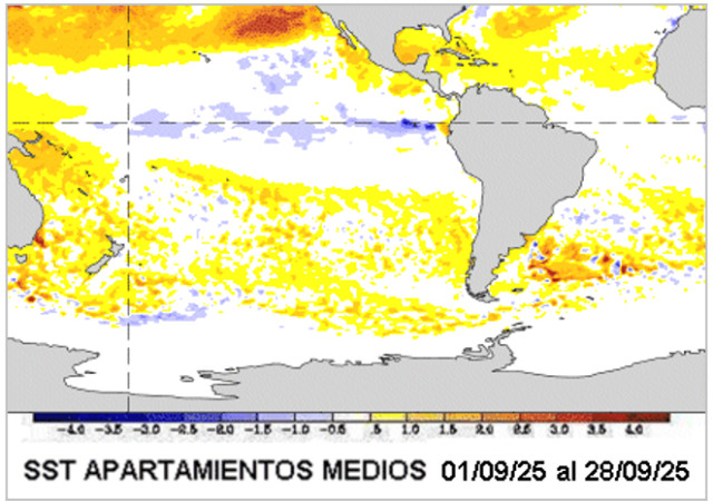 En una primera inspección del mapa que promedia las anomalías superficiales del Pacífico Ecuatorial, el enfriamiento se ve modesto pero afianzado, teniendo en cuenta lo que sucedía a finales de agosto. En rigor es una situación que apenas puede ser considerada como la génesis de un fenómeno La Niña y como sabemos la intensidad y la persistencia de este enfriamiento son determinantes a la hora de evaluar el impacto que este episodio puede tener en la actual campaña.